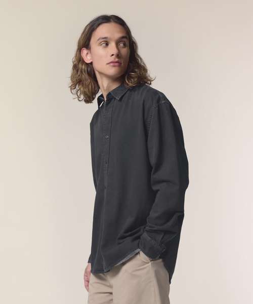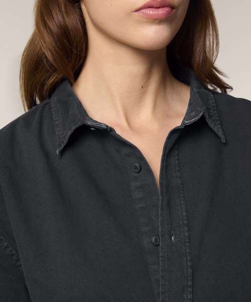 The Worker shirt. Relaxed unisex fit. Point collar with single-needle topstitches. Collar stand. Front placket with single-needle topstitches on each side. Forwarded shoulder. Back yoke. Inside yoke in self-fabric. Set-in sleeves. Sleeve placket with one button. Cuff with two buttons. Rounded cuff corners. Double pleats at cuff seam. Garment-Dyed Black Rock colour has a faded look on all seams due to garment washing. Garment-dyed product, so each garment may vary in appearance and colour may bleed – follow our care label. Read print recommendations carefully.