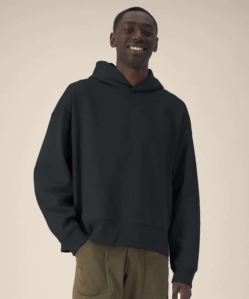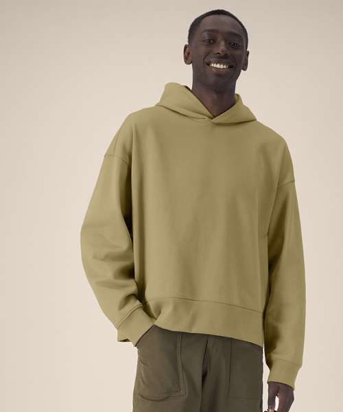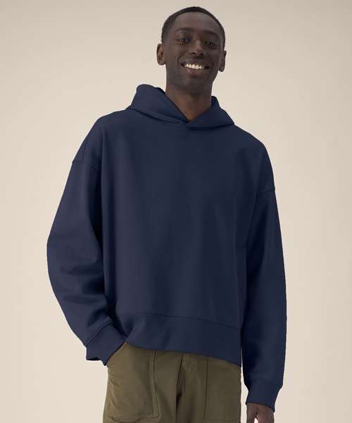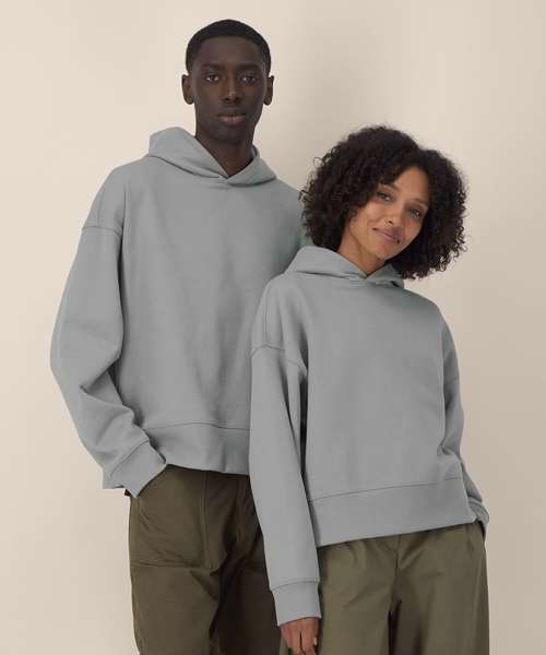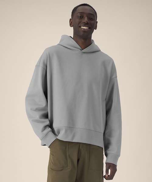 Unisex recycled cotton boxy hoodie. Set-in sleeves. Double-layered hood in self-fabric. 1x1 rib at sleeve cuffs and hem. Twin-needle topstitching on seams at shoulders, armholes, sleeve cuffs and hem. Inside herringbone back neck tape. Self-fabric half-moon at the back neck. Contains 50% GRS-certified recycled cotton and 50% OCS-certified organic cotton, certified by Control Union CB-CUC-1393082.