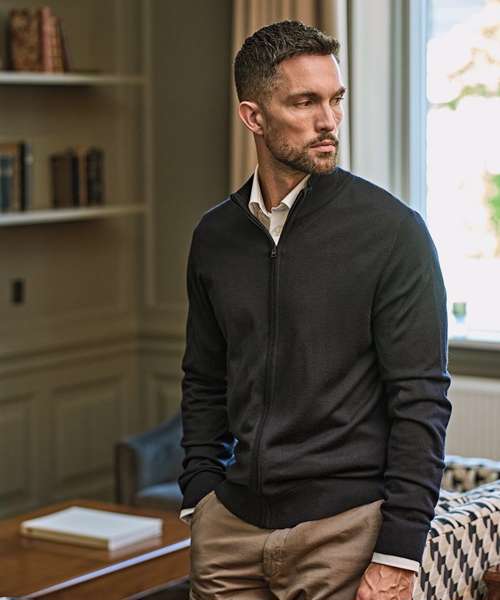 Tailored fit. Full-zip. Fully fashioned. SBS zip. Knitted rib at hem and cuffs. 30˚C washing on wool programme. Quality Italian merino/polyacrylic yarn.