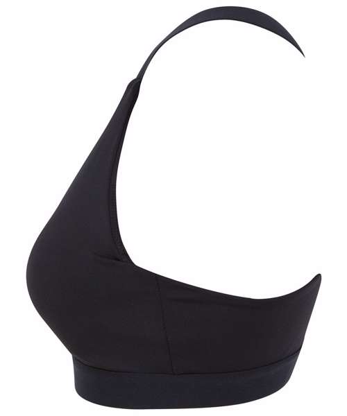 Women's core bra with medium impact. Round neckline with cross over elastic strap back. Bra clasp fastening. Permanent cups, non removeable. Tear-out label.