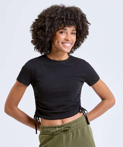 Cropped t-shirt. Short sleeve. Ruched detailing to sides. Tie fastenings. Crew neck.