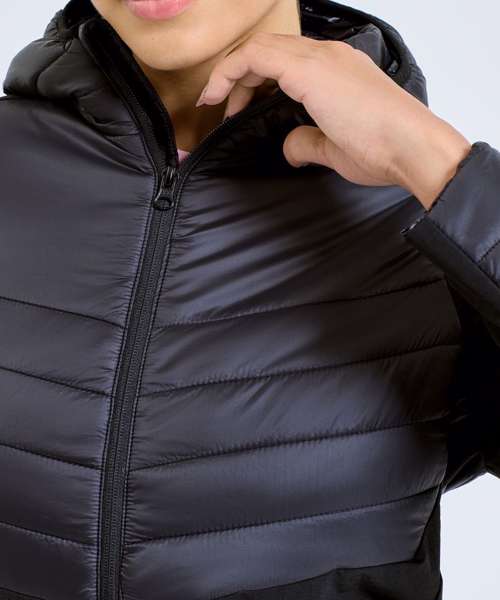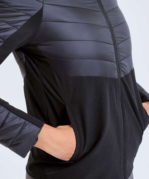 Hybrid jacket with diagonal quilted upper chest and back. Lower jacket is shell fabric. Full zip-through style with panelled hood. Hood is elasticated for a snug fit. Front pockets. Quilted detailing to arms with lower arm in shell fabric. Internal storm flap with zip guard. We recommend using block out vinyl and inks.