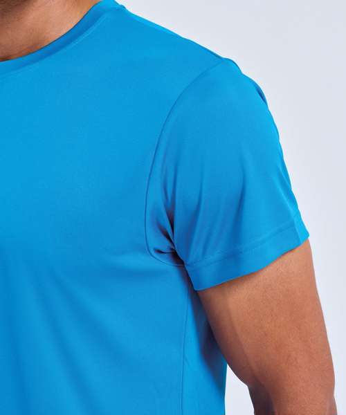 Wicking fabric. Stretch. Crew neck. Short sleeve. Lightweight. Twin-needle stitching on hem and arms. Recycled polyester. We recommend using block out vinyl and inks. UPF 40+.