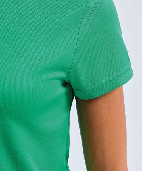 Performance T-shirt. Cationic dyed. Recycled polyester. Wicking fabric. Stretch. Crew Neck. Short Sleeve. Lightweight. Feminine fit. Twin-needle stitching on hem and arms. Textured fabric. UPF 40+.
