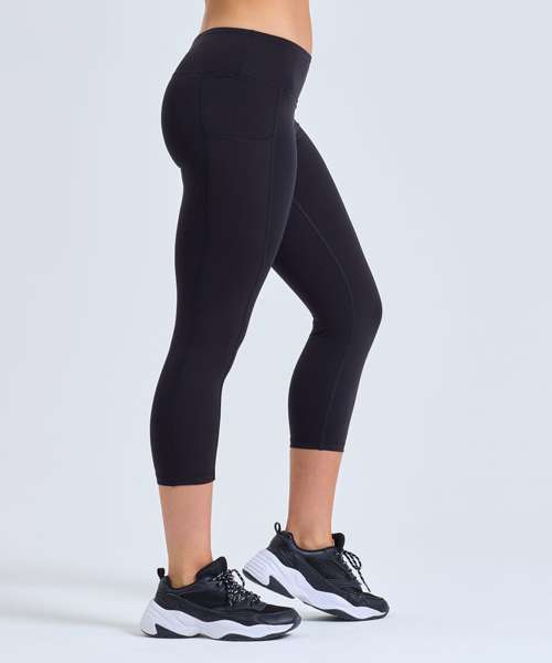 3/4-length leggings. Soft-stretch fabric. Elasticated waistband. Black inner waistband and coin pocket. Side panels to legs with hidden insert pocket. Recycled Polyester. We recommend using block out vinyl and inks.