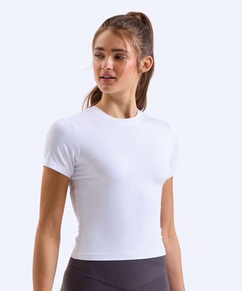 Crew neck. Short sleeves. Fitted tee. Certified recycled Polyester. Elastane. Stretch. Smooth finish.