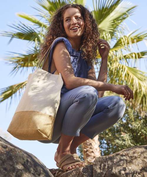 Embrace practical, sustainable style with this jute base canvas shopper. With a premium cotton canvas body, this natural carryall is a print-friendly option for custom decoration and embroidery and the hard-wearing dipped jute base has been designed with the big shop in mind.