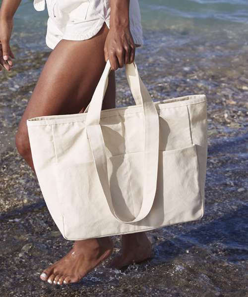 Premium heavyweight fabric. Durable canvas construction. Large capacity. Two front pockets. Zipped main compartment. Nylon zip with self-fabric pull. Dual self-fabric carry handles. Can be carried by hand or over the shoulder. CutAway label for ease of rebranding.