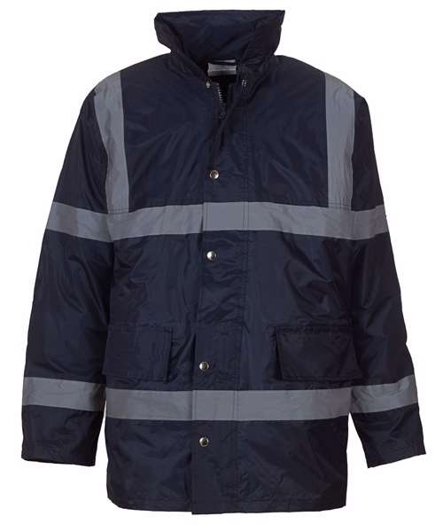 Fully waterproof & windproof security jacket with the enhanced visibility for safety. PU coated Nylon outer fabric with 190g quilted padding and Nylon lining. Heavy duty zip with studded storm flap. 2 outer pockets with over flaps. Elasticated Knitted storm cuffs in the sleeve ends. Step collar with a concealed integral hood. Inside breast pocket. Throughout stitched and taped seams to ensure waterproof. Matching trousers available, code HVS461.